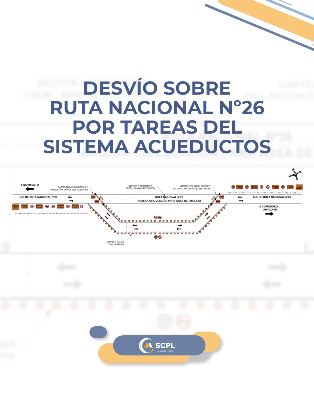 Recordamos que continúa vigente el desvío sobre la ruta nacional Nº 26 a la altura de Pampa del Castillo, entre los kilómetros 36 y 37, por trabajos programados del Sistema Acueductos que se extenderán a lo largo de 10 días más. Cabe destacar que su realización queda sujeta a condiciones climáticas favorables y que estas tareas no afectarán el suministro de agua en Comodoro Rivadavia.
