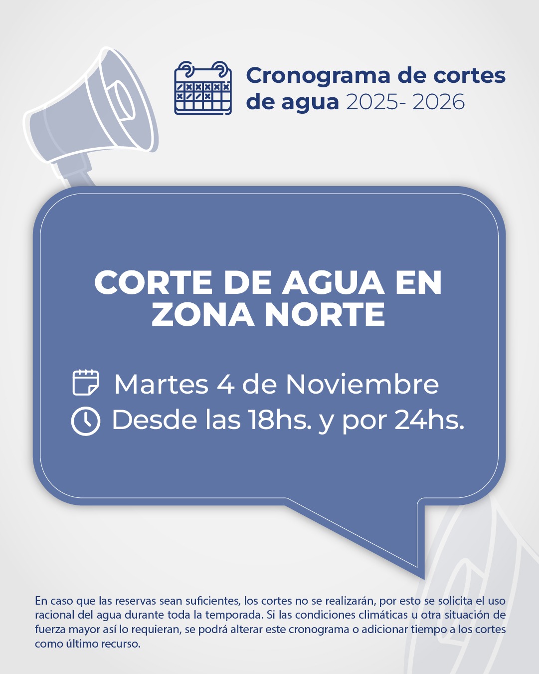 Hoy, martes 04 de noviembre, desde las 18hs. y por un lapso de 24hs., se interrumpe el suministro de agua en Zona Norte; y mañana, miércoles 05 de noviembre, desde las 18hs. y por 24hs, se interrumpe en Zona Sur y Central, para recuperar las reservas de Puesto La Mata.