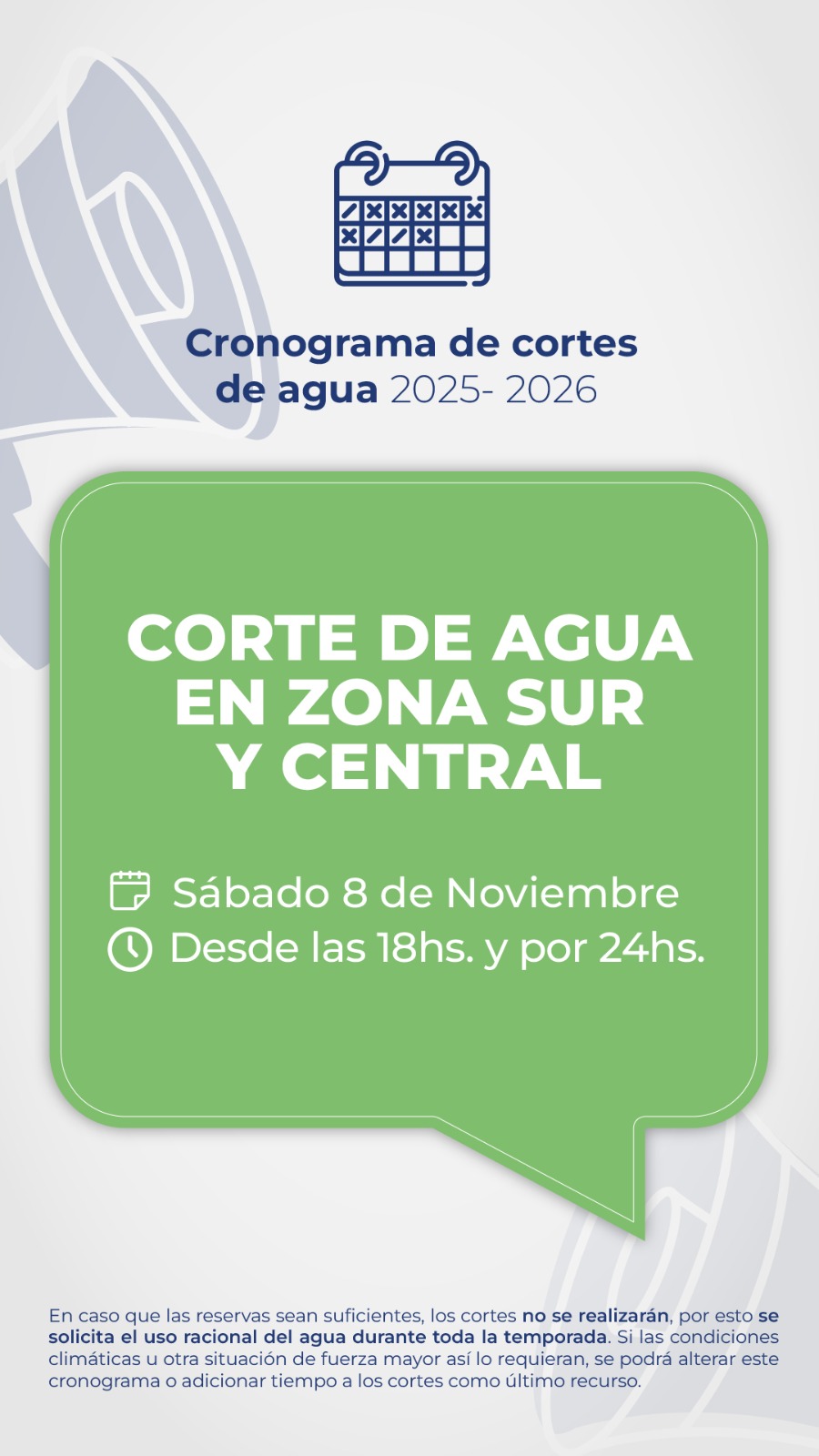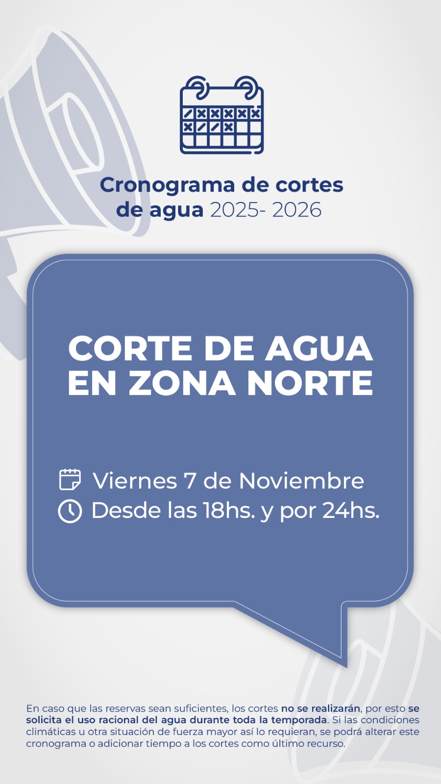Hoy, viernes 07 de noviembre, desde las 18hs. y por un lapso de 24hs., se interrumpe el suministro de agua en Zona Norte; y mañana, sábado 08 de noviembre, desde las 18hs. y por 24hs, se interrumpe en Zona Sur y Central, para recuperar las reservas de Puesto La Mata.