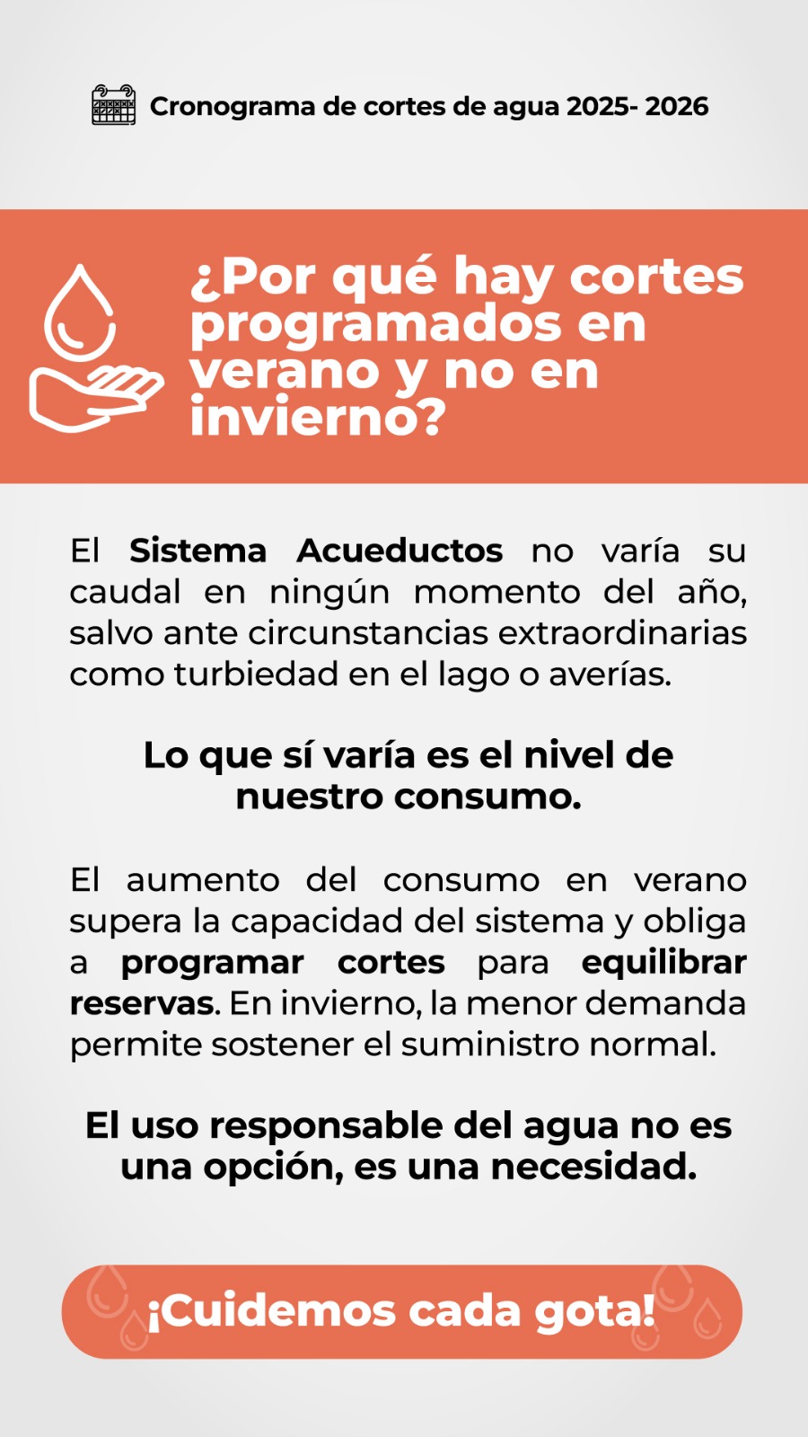 El Sistema Acueductos no varía su caudal en ningún momento del año, salvo ante circunstancias extraordinarias como turbiedad en el lago o averías. Lo que sí varía es el nivel de nuestro consumo.