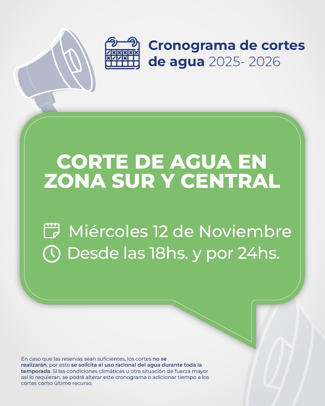 Hoy, martes 11 de noviembre, desde las 18hs. y por un lapso de 24hs., se interrumpe el suministro de agua en Zona Norte; y mañana, miércoles 12 de noviembre, desde las 18hs. y por 24hs, se interrumpe en Zona Sur y Central, para recuperar las reservas de Puesto La Mata.