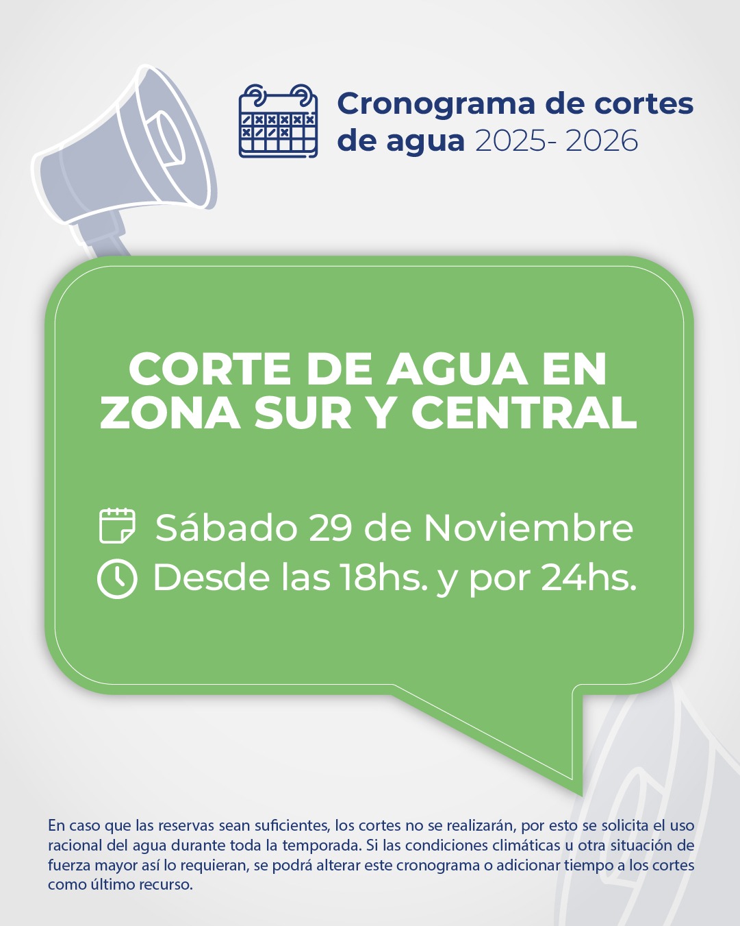 Hoy, viernes 28 de noviembre, desde las 18hs. y por un lapso de 24hs., se interrumpe el suministro de agua en Zona Norte; y mañana, sábado 29 de noviembre, desde las 18hs. y por 24hs, se interrumpe en Zona Sur y Central, para recuperar las reservas de Puesto La Mata.