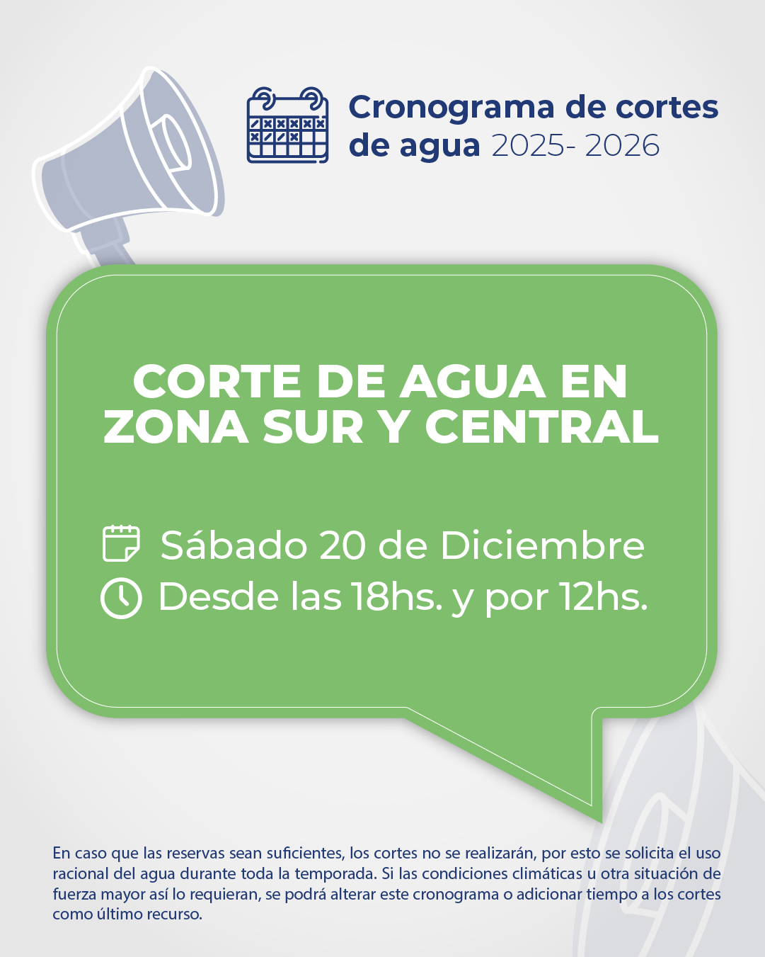 Hoy, viernes 19 de diciembre, desde las 18hs. y por un lapso de 24hs., se interrumpe el suministro de agua en Zona Norte; y mañana, sábado 20 de diciembre, desde las 18hs. y por 24hs, se interrumpe en Zona Sur y Central, para recuperar las reservas de Puesto La Mata.