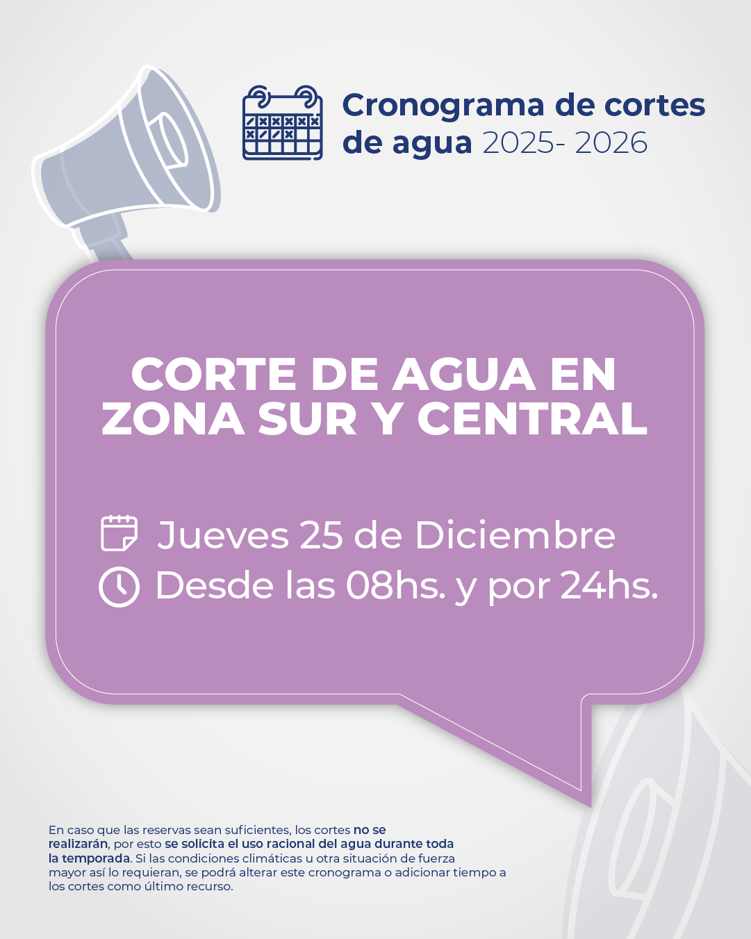 En el marco de las fiestas navideñas, hoy martes 23 de diciembre, desde las 12hs. y por un lapso de 24hs., se interrumpe el suministro de agua en Zona Norte; y el jueves 25 de diciembre, desde las 08hs. y por 24hs, se interrumpe en Zona Sur y Central, para recuperar las reservas de Puesto La Mata.