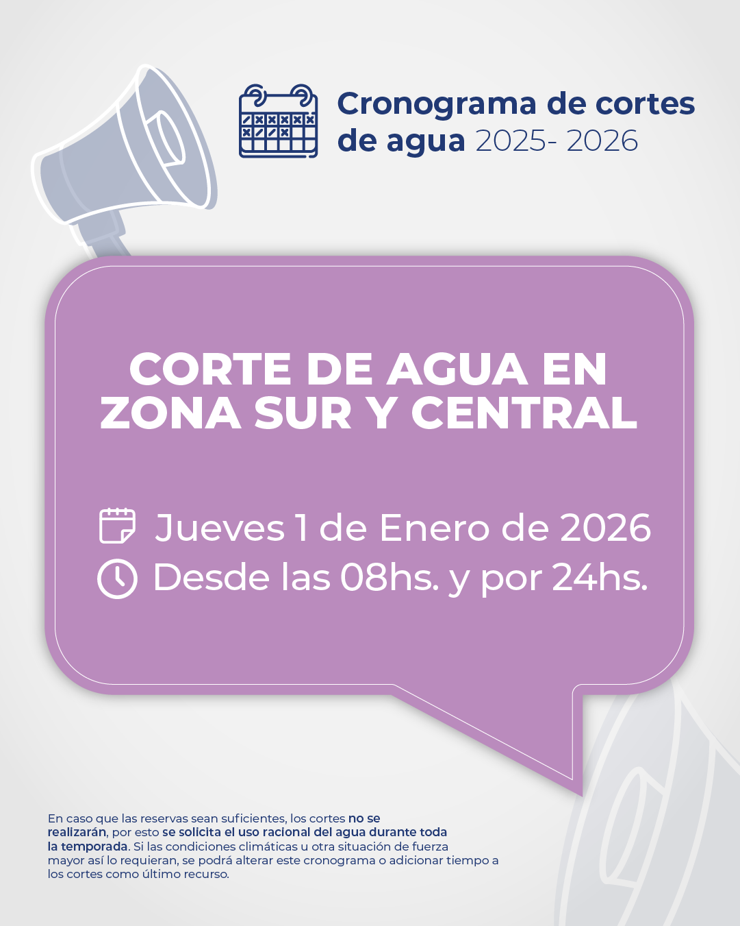 En el marco de las fiestas navideñas, hoy martes 30 de diciembre, desde las 12hs. y por un lapso de 24hs., se interrumpe el suministro de agua en Zona Norte; y el jueves 01 de enero de 2026, desde las 08hs. y por 24hs, se interrumpe en Zona Sur y Central, para recuperar las reservas de Puesto La Mata.