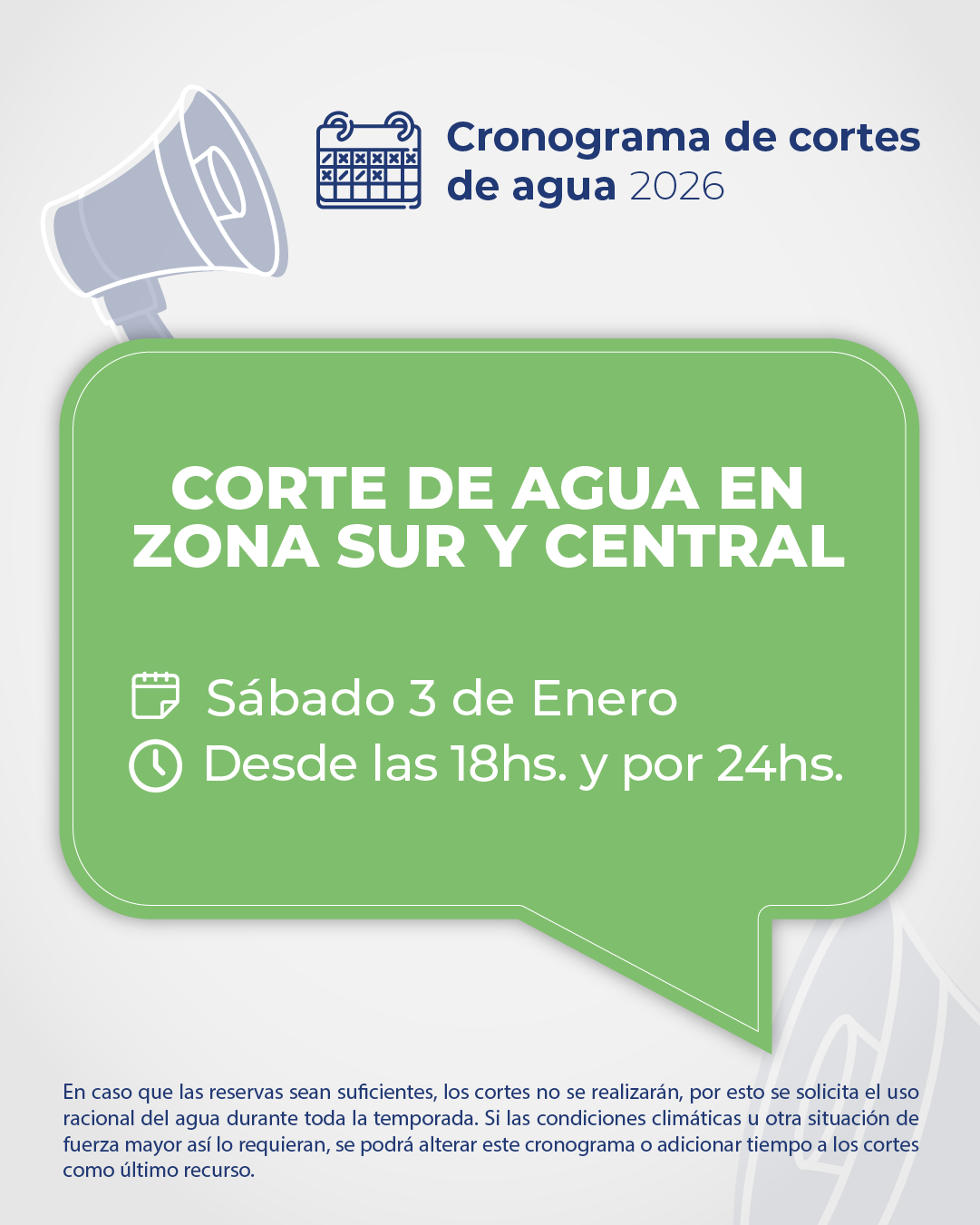 Hoy, viernes 02 de enero, desde las 18hs. y por un lapso de 24hs., se interrumpe el suministro de agua en Zona Norte; y mañana, sábado 03 de enero, desde las 18hs. y por 24hs, se interrumpe en Zona Sur y Central, para recuperar las reservas de Puesto La Mata.