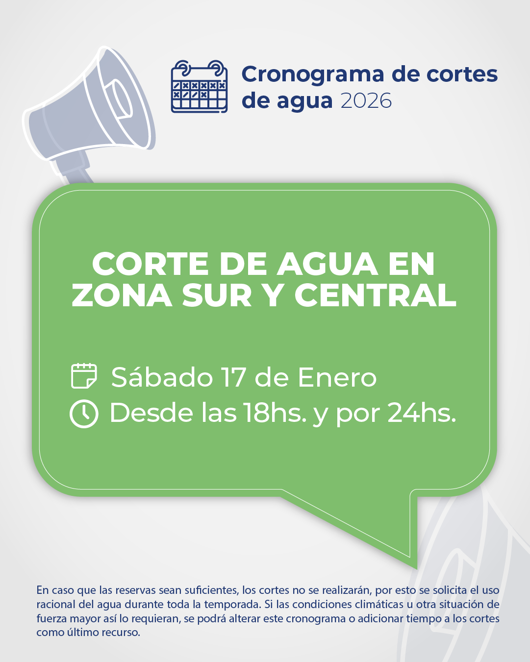 Hoy, viernes 16 de enero, desde las 18hs. y por un lapso de 24hs., se interrumpe el suministro de agua en Zona Norte; y mañana, sábado 17 de enero, desde las 18hs. y por 24hs, se interrumpe en Zona Sur y Central, para recuperar las reservas de Puesto La Mata.