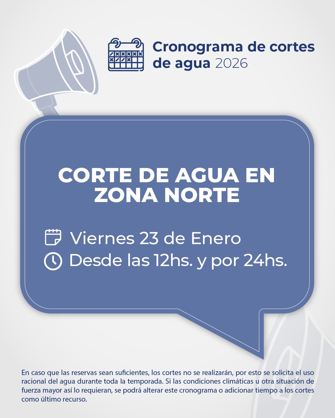 Debido a una avería detectada en un tramo del acueducto del '66, hoy viernes 23 de enero, se adelanta el corte previsto para Zona Norte a partir de las 12:00hs. y por un lapso de 24hs.