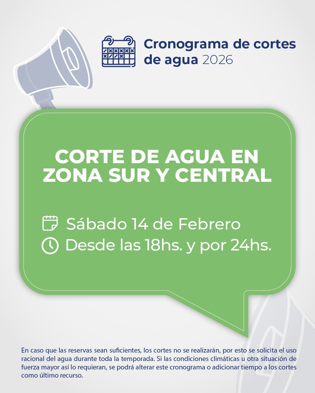 Hoy, viernes 13 de febrero, desde las 18hs. y por un lapso de 24hs., se interrumpe el suministro de agua en Zona Norte; y mañana, sábado 14 de febrero, desde las 18hs. y por 24hs, se interrumpe en Zona Sur y Central, para recuperar las reservas de Puesto La Mata.
